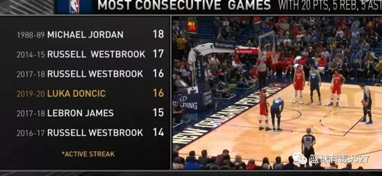 这也是东契奇连续第16场比赛至少砍下20分5板5助的数据,追平了2017-18赛季的威少,位列NBA历史第三。