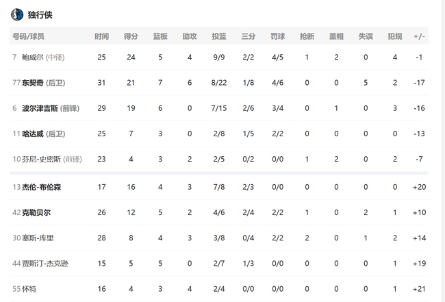在这场比赛中,独行侠在主场面对实力不俗的森林狼,在第二节的时候,他们遭受到了对手的强力狙击,第二节,他们仅让独行侠得到23分,然而,好在前三节除了东契奇表现不错之外,球队主力中锋鲍威尔9投9中砍下24分5篮板4助攻,仅仅三节过后,鲍威尔就砍下24分。作为一名内线球员,鲍威尔还投进了两个三分球,本场比赛弹无虚发。