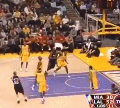 不过故事可并没有结束,在隔扣结束后的下一个回合,拜纳姆马上给出了回击,他接科比的传球之后,一个转身过掉奥尼尔,同样来了一次扣篮!