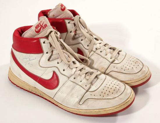 它的珍贵之处还在于,这双鞋记载了Michael Jordan第一次对阵由Magic Johnson与Abudul Jabbar率领的紫金王朝。这双鞋的现身,引起了极大的轰动,最终的成交价格也被锁定在了71554美元,堪称天价。
