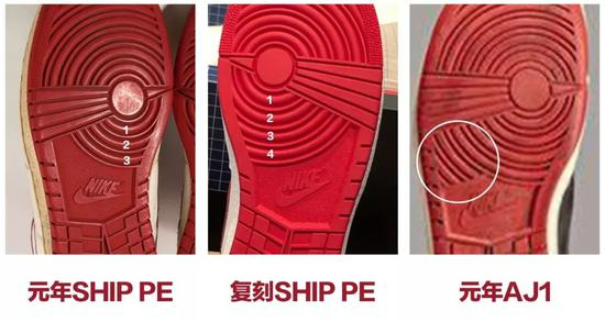 此番复刻的Air Ship PE是直接采用了市售版Air Jordan 1的鞋底系统吗?NO!通过对比我们能看出,它更接近于元年Air Ship PE的鞋底,虽然还是有差别,但是已经在努力还原了。