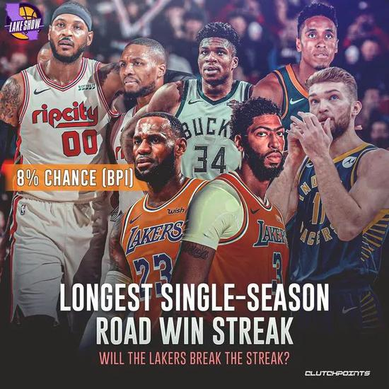 湖人目前已经取得了客场14连胜,排在NBA历史客场连胜纪录第三,仅次于1971-72赛季湖人的客场16连胜以及1994-95赛季爵士的客场15连胜。湖人若想打破这一纪录,接下来的三个客场面对步行者、雄鹿、开拓者都得全胜,美媒认为他们打破历史纪录的概率仅为8%。
