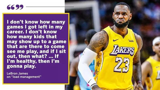 “除非到了赛季末段,我们的常规赛排名已经锁定,不能再好也不会更差,那么(负荷管理)就会有好处。不过如果我是健康的, 我为什么不打球呢?我不知道我的生涯还剩多少场比赛,我也不知道有多少孩子来看我打球,如果我休息了那会怎样?那是我的责任,我有责任为队友出战。如果健康我就打,如果教练不让我打,那就意味着我不健康,就这么简单。”
