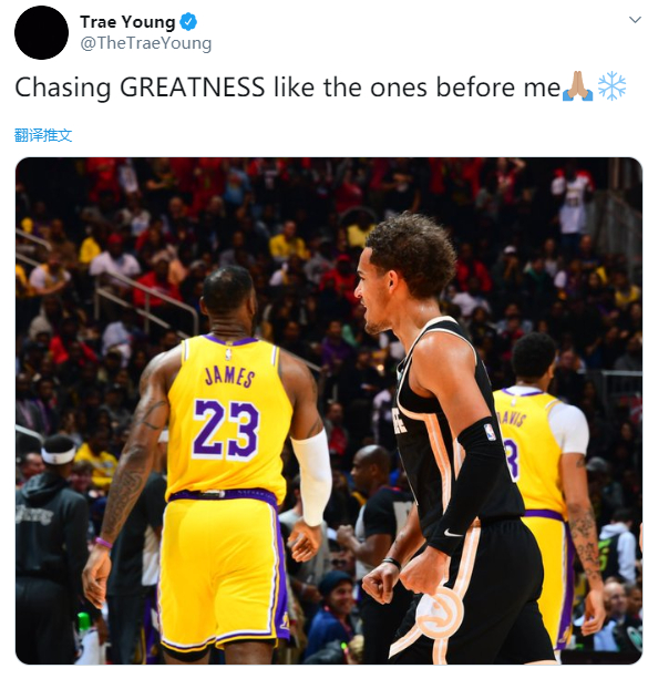 老鹰新星特雷-杨发推致敬詹姆斯的伟大成就:“我也要像我身边的这些前辈一样去追逐伟大,致敬!”
