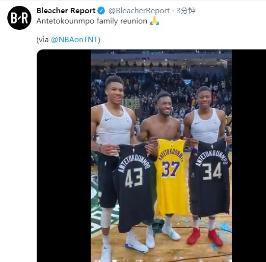 北京时间12月20日,密尔沃基雄鹿在主场以111-104战胜了洛杉矶湖人。赛后,字母哥三兄弟合影留念。在合影中,吉安尼斯-安特托孔波与自己的哥哥萨纳西斯-安特托孔波还有为湖人效力的弟弟科斯塔斯-安特托孔波一起拿着各自的球衣留念。有趣的是,三兄弟拿的球衣名字都是一样的,只是号码不同。