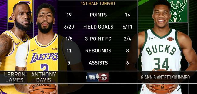 湖人此后试图反攻,经过休息调整重回场上的字母哥迅速率队还击保持领先。半场结束时雄鹿领先19分,字母哥得到16分,11投6中,三分球4投2中,还有8个篮板和6次助攻。仅从统计上你就可以看得出字母哥的表现有多么出色,他不仅能用单打去杀伤湖人防守,还能给队友们创造机会。同样是在上半场,湖人的勒布朗-詹姆斯和戴维斯一共得到19分,两人20投6中,三分球5投1中,还有11个篮板和5次助攻。字母哥与詹眉两人相比都毫不逊色,这就是雄鹿能取得大比分领先的原因。