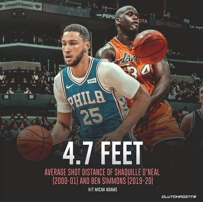 根据数据统计本赛季本西蒙斯场均投篮出手与篮筐的平均距离,和2000-2001赛季的奥尼尔一模一样,都是4.7英尺,大约为1.43米。这样的距离意味着西蒙斯大部分出手都是集中在篮下。