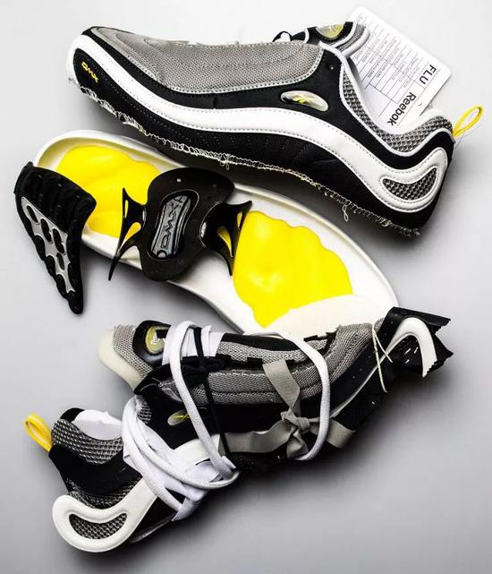 于是,Reebok安排Steven Smith、Steve Burris、Peter Foley、Paul Litchfield四位设计师通力合作,以Maepsy为名开发一款前所未有的Pump跑鞋。在设计与研发过程中,他们除了运用自己本就丰富的设计经验,更是大胆地采用了一些在此前运动鞋领域中前所未有的疯狂想法。