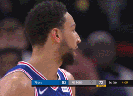 76人进攻,西蒙斯在活塞中锋伍德头上连续抢下前场板,完成二次进攻上篮。