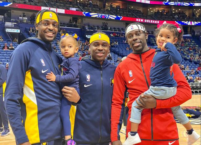 北京时间12月29日,鹈鹕今天对阵步行者,霍勒迪家族赛前合影留念。这是霍勒迪三兄弟首次同场竞技。