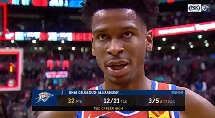 这场比赛亚历山大砍下32分7板3抢断2助攻,32分追平其职业生涯最高得分纪录。