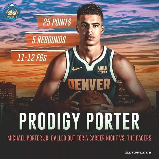 北京时间1月3日,在掘金124比116战胜步行者的比赛中,小波特替补出场23分钟,12投11中,三分3中2,砍下职业生涯得分新高的25分,外加5篮板1助攻。