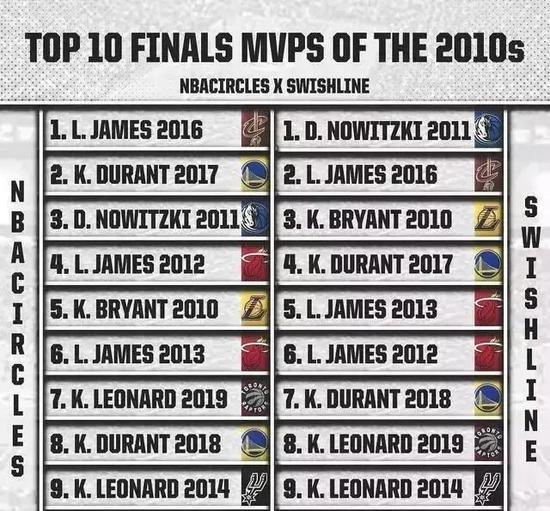 第七的位置,两家美媒互换了一下杜兰特和伦纳德,也就是说两家美媒认为伦纳德和杜兰特的这两次FMVP,不是第七就是第八,含金量相差不大。