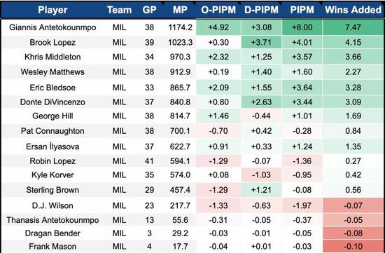 正负值:湖人队对于詹姆斯的过度依赖某种程度上证明了詹姆斯对湖人的价值,詹姆斯在场和在的1325分钟里,湖人百回合净胜对手12.7分,他不在场的600分钟里,湖人百回合净负对手1.5分;字母哥在场的1195分钟里,雄鹿百回合净胜对手15.2分,他不在场的826分钟里,雄鹿百回合也净胜对手7.5分。雄鹿离了字母哥还是一只强大的球队,湖人离了詹姆斯就真的是举步维艰了。