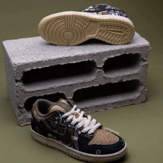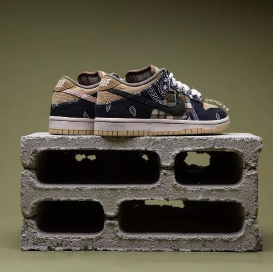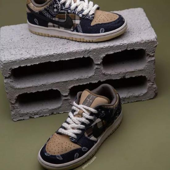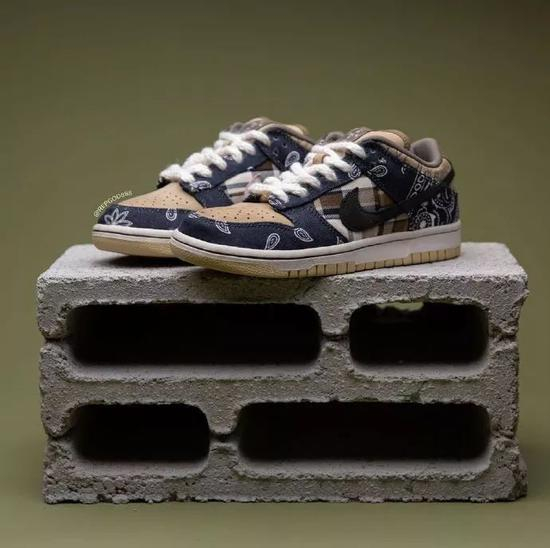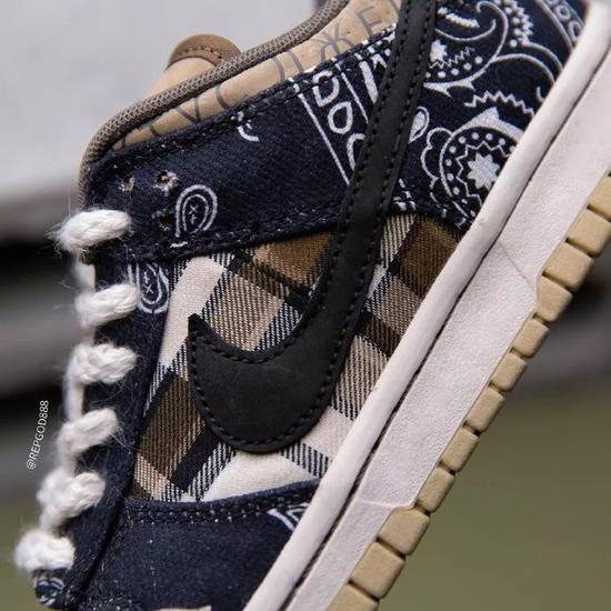之前传闻的拼接设计被证实,鞋面以卡其色为主色调,配上腰果花和格纹的靛蓝色帆布以及内外不同色 Swoosh,细节非常丰富。此外,据称该鞋款还暗藏“彩蛋”,可玩性十足。但究竟实物将会有哪些玩法,我们只能拭目以待。据传闻,这双 Travis Scott x Nike Dunk SB Low 将于 2 月份发售。