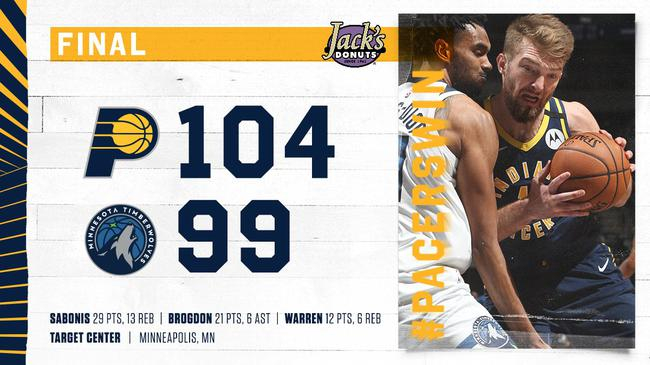 步行者(26-15)三连胜。多曼塔斯-萨博尼斯得了29分、13个篮板和6次助攻,马尔科姆-布罗格登21分、6个篮板和6次助攻,TJ-沃伦12分6个篮板。