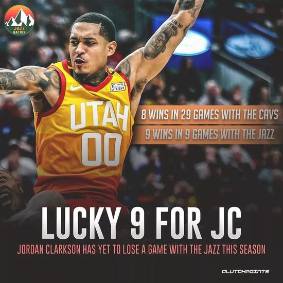 爵士能取得这样的成绩,都和一个男人有关,他就是本赛季刚被交易过来的克拉克森。自从他加入球队,爵士还未尝败绩。最近的两场比赛,克拉克森都极好的扮演了第6人的角色,两场砍下43分,是球队的取胜功臣。
