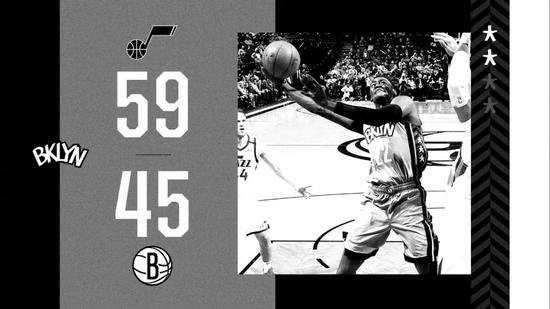 半场结束,分差越拉越大,篮网已经45-59落后了14分。全队只靠欧文一人支撑,他上场15分钟,拿下12分1板3助1断1帽填满数据栏。爵士这边英格尔斯三分5中4,高效砍下15分3板。