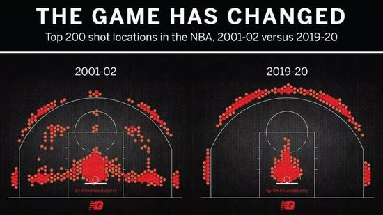 说句题外话,现在联盟的进攻确实十分依仗三分,今日NBA数据分析师Kirk Goldsberry晒出一张投篮热图,统计了2001-02和2019-20这两个赛季的投篮区域分布,仅仅18年时间,中距离几乎消失,三分为王。