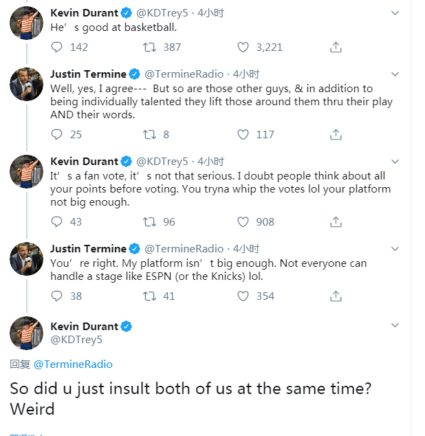 “你说得对。我的平台是不够大,不是每个人都能应对ESPN或者尼克斯这样的平台。”特迈尔回复杜兰特。