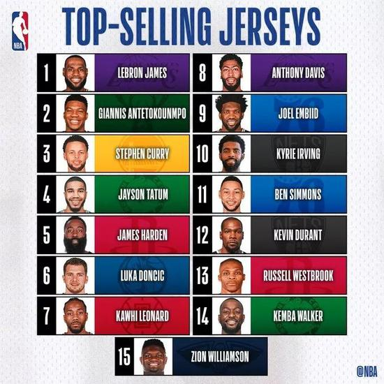 Zion的牌面是有的,一场比赛没打,球衣销量排第15。