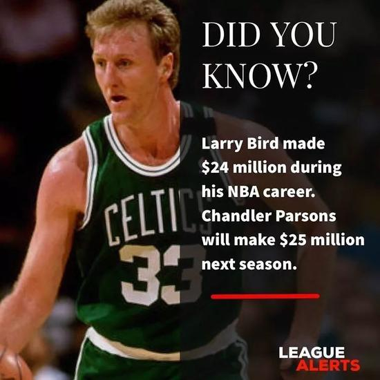 只有媒体不会忘记这个具有争议的落魄男人,时常拎他出来鞭笞一番。在被交易至亚特兰大老鹰后,美国媒体上传了一张拉里-伯德和钱德勒-帕森斯的工资对比图。时代更迭下的巨变太过真实,伯德辉煌职业生涯的全部工资仅为2400万美元,甚至不如此时帕森斯一年领到的2500万美元。