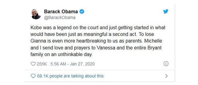“科比是球场上的一个传奇,他人生的第二幕才刚刚开始。失去吉安娜(科比女儿)对作为父母的我们来说更令人心碎。在这不可思议的一天,米歇尔和我向瓦妮莎和科比全家致以爱与祈祷。”