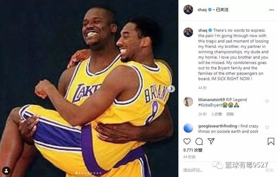 “此刻,我失去了一位挚友,一个兄弟,一个陪伴我赢得冠军的伙伴!科比就是我的兄弟和家人!我内心现在的痛苦无法用言语来表达!我爱你!兄弟!你会被永远铭记!向布莱恩特的家人和机上其他乘客的家人表示哀悼!我现在难过透了!”奥尼尔写道。