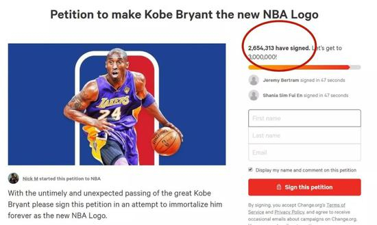 作为影响一代人的巨星,科比的离去让大家久久不能释怀。除了用8秒和24秒违例来致敬,还有不少人希望能有更多的方式,来纪念科比。有人发起了更换联盟logo的请愿,目前已经有超过200万人参与。