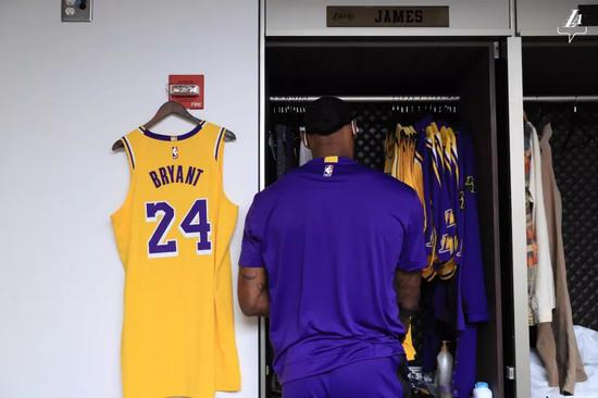老詹逐渐走出了悲伤,在今日赛前,他特意将一件科比球衣挂在了自己的更衣柜旁,同时也在赛前训练时上脚科比战靴。