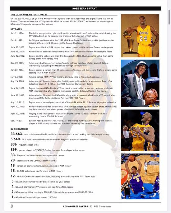 湖人也为这场比赛准备了很多。据随队记者Bill Oram报道,湖人在前一天给媒体发送的比赛备忘录中,特意加入了科比在湖人的大事记,除此之外,科比的水印也出现在了备忘录的每一页上。