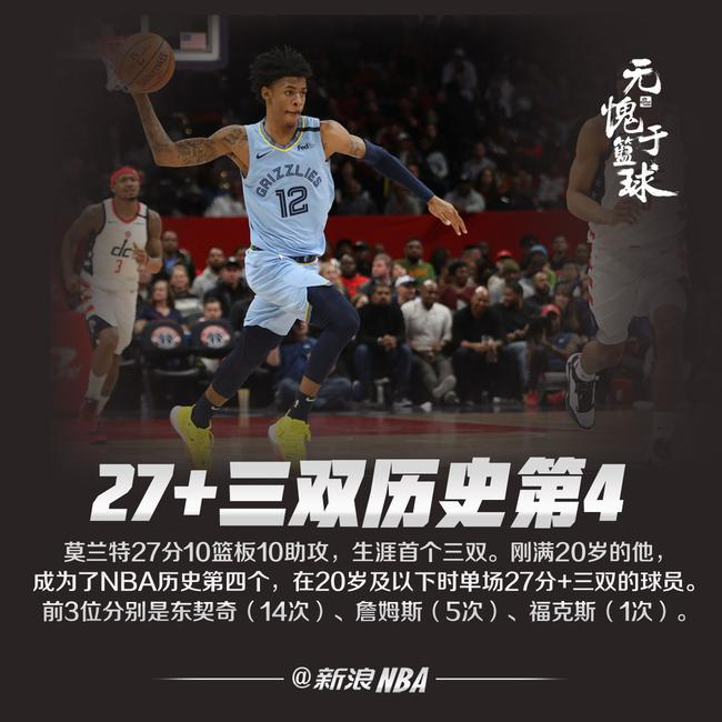 北京时间2月10日,灰熊击败奇才,莫兰特拿到了职业生涯首个三双。这让刚满20岁的他,成为了NBA历史第四个,在20岁及以下时单场27分+三双的球员。
