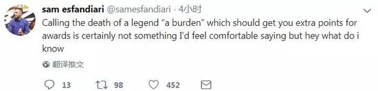 湾区95.7TheGame电台编辑Esfandiari就对此批评说:“将一位传奇的死描述成负担可能会给某某奖项带来加分,这绝不是我能舒服地说出来的话,但我又知道什么呢?”