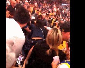 近日湖人客场击败勇士,不仅赛场上剑拔弩张,观众席也是看得基情四射,几位球迷无视旁人当众就干了起来。