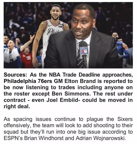 结合总经理布兰德交易截止日前那番话的中心思想——除了西蒙斯外,其他人皆可交易费城俨然一副风雨欲来的架势恩比德的离开已经不是不可能了