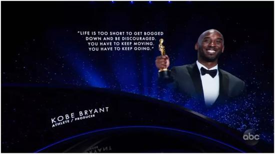 科比曾凭借《亲爱的篮球》,获得第90届奥斯卡最佳动画短片奖。本届组委会也制作短片,缅怀了那些逝去的电影人。当大屏幕上出现科比时,一旁的文字写着:“人生苦短,你会陷入泥潭,灰心丧气,你不得不砥砺前行,永不言弃!”