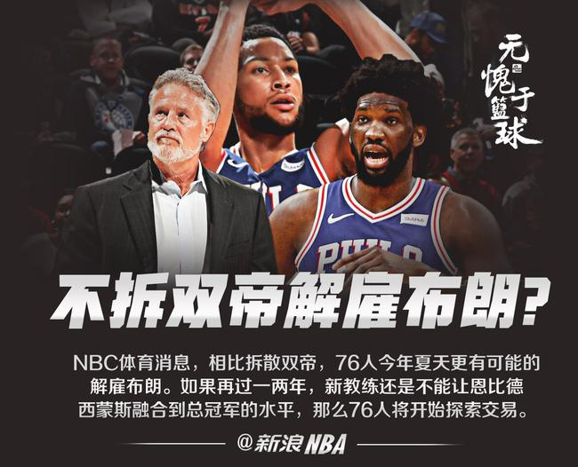 北京时间2月13日,近日,有关76人可能拆散乔尔-恩比德和本-西蒙斯组合的流言不绝于耳,但据NBC体育记者 Kurt Helin的最新报道,相比拆散“双帝”,76人今年夏天更有可能炒掉主教练布雷特-布朗。