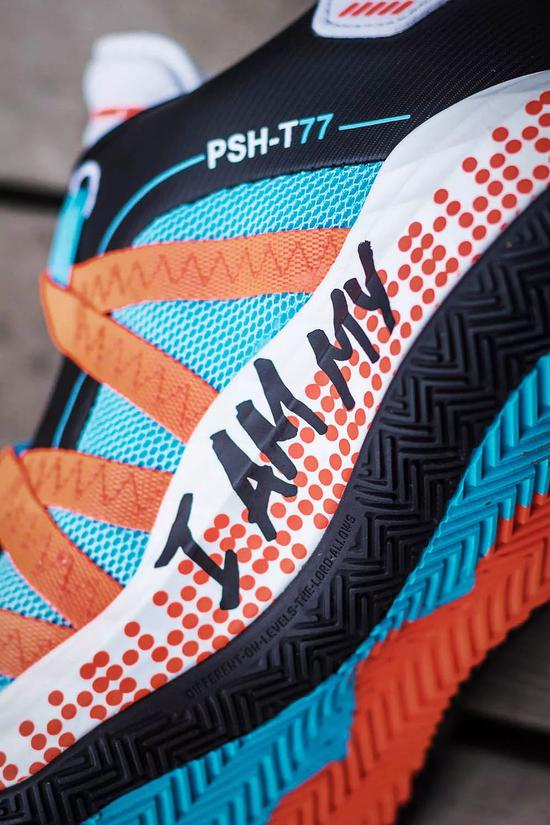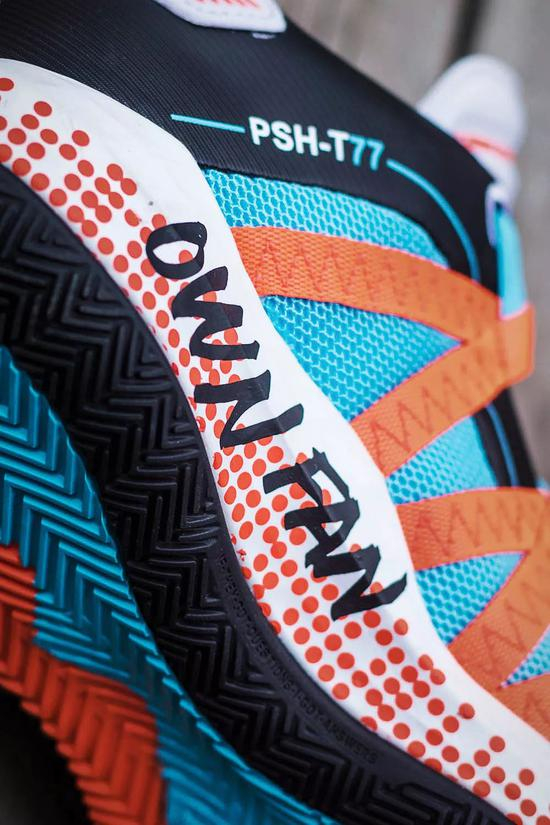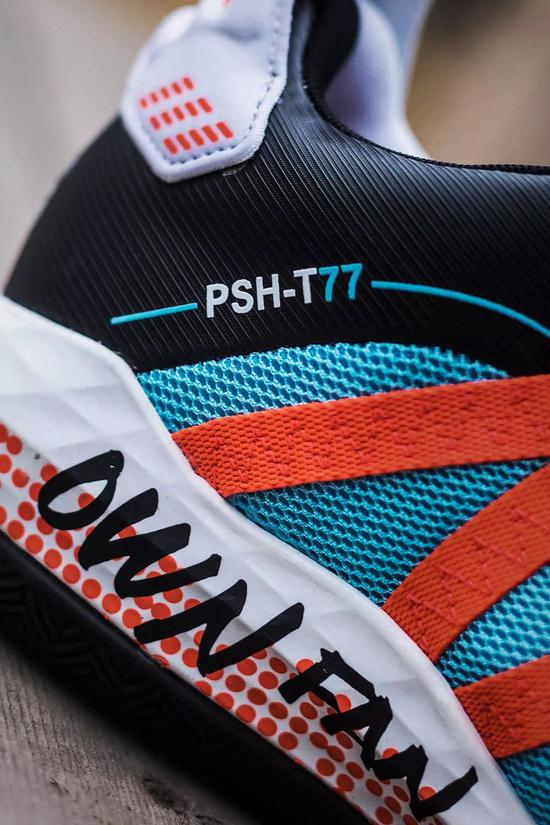 鞋内外两侧的‘PSH-T77’和‘D-L 90’分别代表两人的名字缩写和出生年份,展现联名身份。