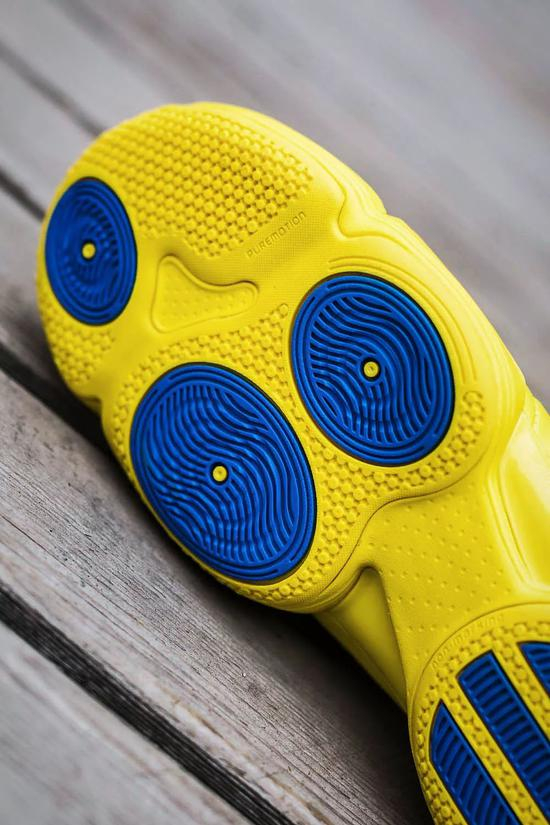 不仅配色扎眼,adiZero Rose 1 的鞋型设计在当时也是革命性的。鞋底采用 Puremotion 系统,这个当时被称为‘新天足’的科技,提供缓震同时兼顾场地感和灵活性。分区鞋底设计和多点外底纹路现在看也是相当前卫。