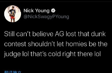 失业少年尼克杨也发推表示:还是无法相信戈登输了扣篮大赛,不应该让兄弟来评判!