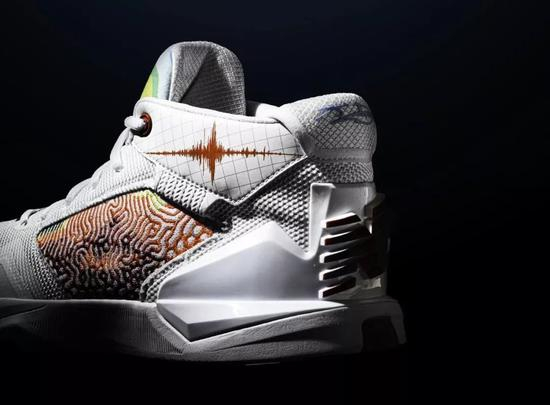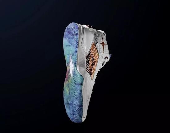 这双签名鞋的鞋底纹路,形状有些像祥云。复杂的图案有助于加强抓地力,有意思的是,球鞋外侧有一个区域,采用的图案和鞋底纹路一模一样。