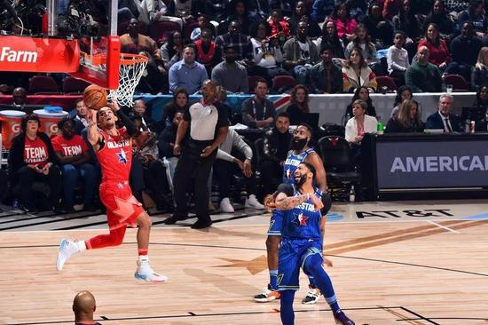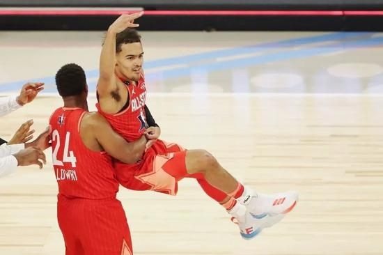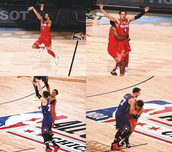 在全明星正赛上虽然表现机会有限,但是特雷杨的那记中圈线出手的超远三分球仍让人印象深刻。