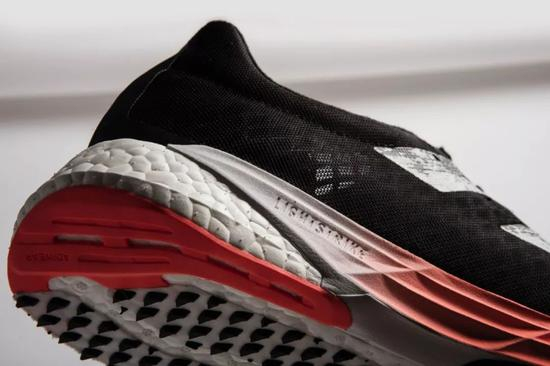 这次Adidas顶级旗舰跑鞋,使用了单层 CELERMESH 透气鞋面,是历史最轻、透气性最佳的材料。并且在中底上使用了Boost科技与LightStrike科技相结合的配置。