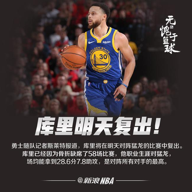 北京时间3月5日,据勇士记者安东尼-斯莱特报道,因为左手伤势连续缺席了58场比赛之后,勇士队当家球星斯蒂芬-库里将在明天主场与猛龙队的比赛中复出。
