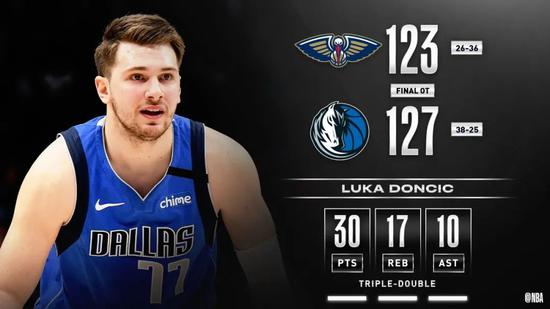 全场比赛,东契奇轰下了第二高的30分外加17个篮板10个助攻的三双数据,职业生涯三双数已经来到了22次,超越基德成为独行侠队史三双王。同时他也成为了独行侠队史首位拿下30+15+10的球员,在球队效力两年不到,就已经是球队各种数据的第一人了,真特么变态。