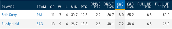 而且在这些投手里,塞斯-库里的运球干拔投篮得分产量也是最高的,场均6.5分的塞斯-库里比起队友波尔津吉斯还要高,后者每场只有3.8分的运球干拔投篮得分而已。