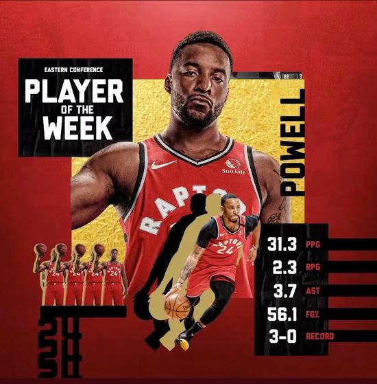场均砍下31.3分2.3篮板3.7助攻2.3抢断,带领人员不整的猛龙三战全胜继续稳居东部第二,交出这份答卷的鲍威尔加冕周最佳实至名归。
