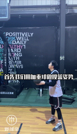 首先,我们用加重篮球做投篮姿势,投向篮板侧沿,这有利于快速唤醒肌肉记忆,强化手腕发力
