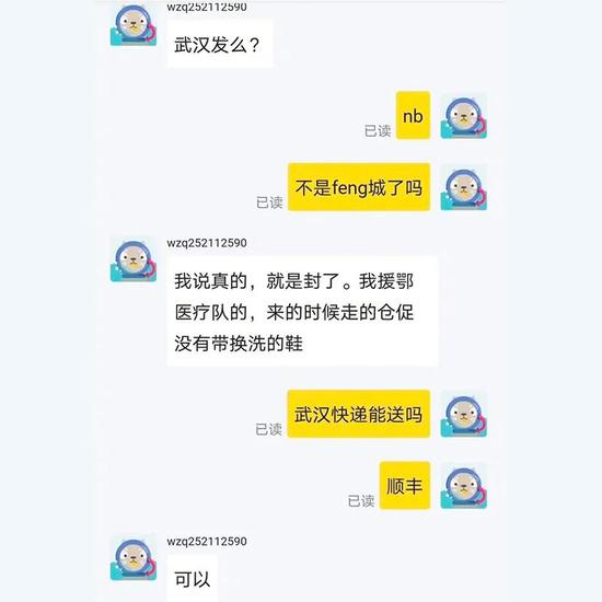 这位武汉医生在抗疫前线因为没有带鞋进行更换,到闲鱼求购,在告知卖家情况之后,这位卖家不仅将鞋送给了他,在快递中还附赠了防护口罩以及 “武汉加油” 标语。