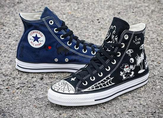 海军蓝和纯黑的Converse x Sean Pablo CONS CTAS Pro High和上一次合作的鞋款没有太大的差异,鞋身上有着跟上一代 Pablo 相似的 Pablo 艺术,大多来源于他身上的纹身,全新的配色,经典百搭黑和“街头工作者”的挚爱蓝。